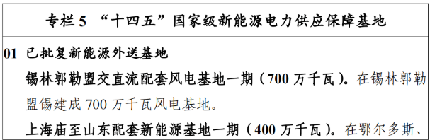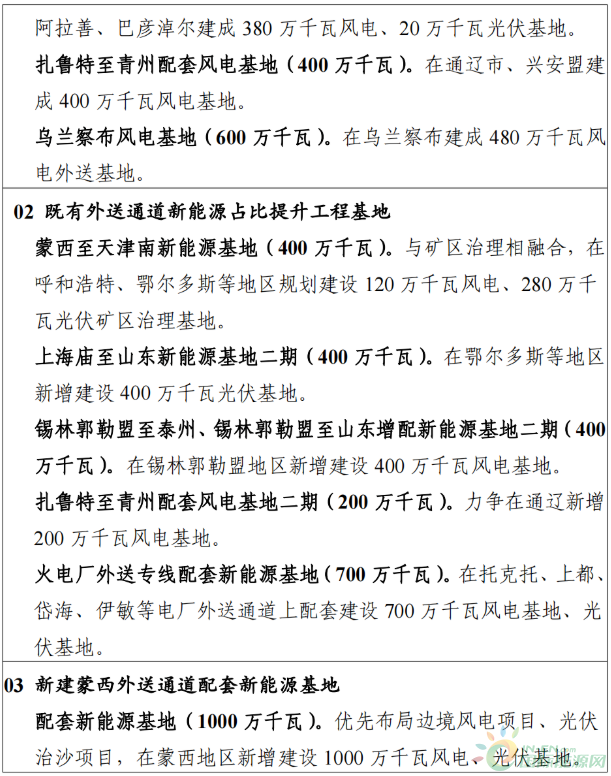 “十四五” 期間,規(guī)劃新增新能源外送基地 2900 萬(wàn)千瓦,力爭(zhēng)累計(jì)投產(chǎn) 3900 萬(wàn)千瓦。力爭(zhēng)2025 年前推動(dòng)開工配套新能源基地 1000 萬(wàn)千瓦。具體如下。