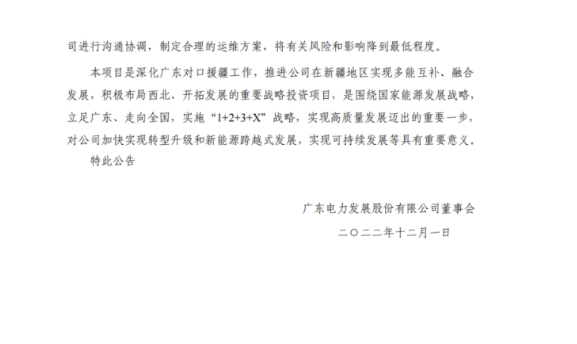 廣東電力表示,本項目是深化廣東對口援疆工作,推進公司在新疆地區(qū)實現(xiàn)多能互補、融合發(fā)展,積極布局西北、開拓發(fā)展的重要戰(zhàn)略投資項目,是圍繞國家能源發(fā)展戰(zhàn)略,立足廣東、走向全國,實施“1+2+3+X”戰(zhàn)略,實現(xiàn)高質(zhì)量發(fā)展邁出的重要一步,對公司加快實現(xiàn)轉(zhuǎn)型升級和新能源跨越式發(fā)展,實現(xiàn)可持續(xù)發(fā)展等具有重要意義。