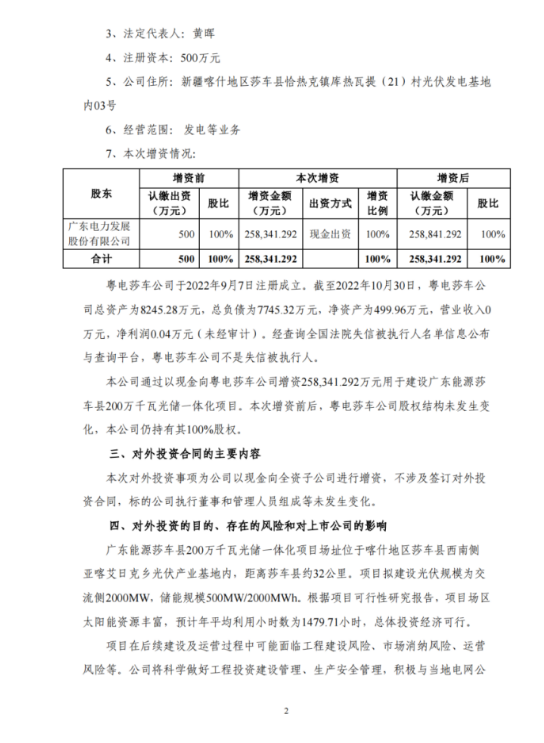 12月1日,廣東電力發(fā)布《關(guān)于投資建設(shè)廣東能源莎車縣200萬千瓦光儲一體化項目》的公告,公告稱,為加快新能源開發(fā)工作,提高清潔能源比重,優(yōu)化電源結(jié)構(gòu),公司董事會同意由全資子公司粵電莎車綜合能源有限公司(以下簡稱“粵電莎車公司”)作為投資主體,投資建設(shè)廣東能源莎車縣200萬千瓦光儲一體化項目。項目總投資1,291,706.46萬元人民幣。