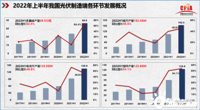 7月20日,工信部發布2022年H1中國光伏產業運行情況。根據測算,2022年H1全國多晶硅產量約36.5萬噸,同比+53.4%;全國硅片產量約152.8GW,同比+45.5%;全國晶硅電池產量約135.5GW,同比+46.6%;全國晶硅組件產量約123.6GW,同 比+54.1%。2022年H1組件出口量達78.6GW,同比增長74.3%;光伏產品出口總額約259億美元,同比增長113.1%。