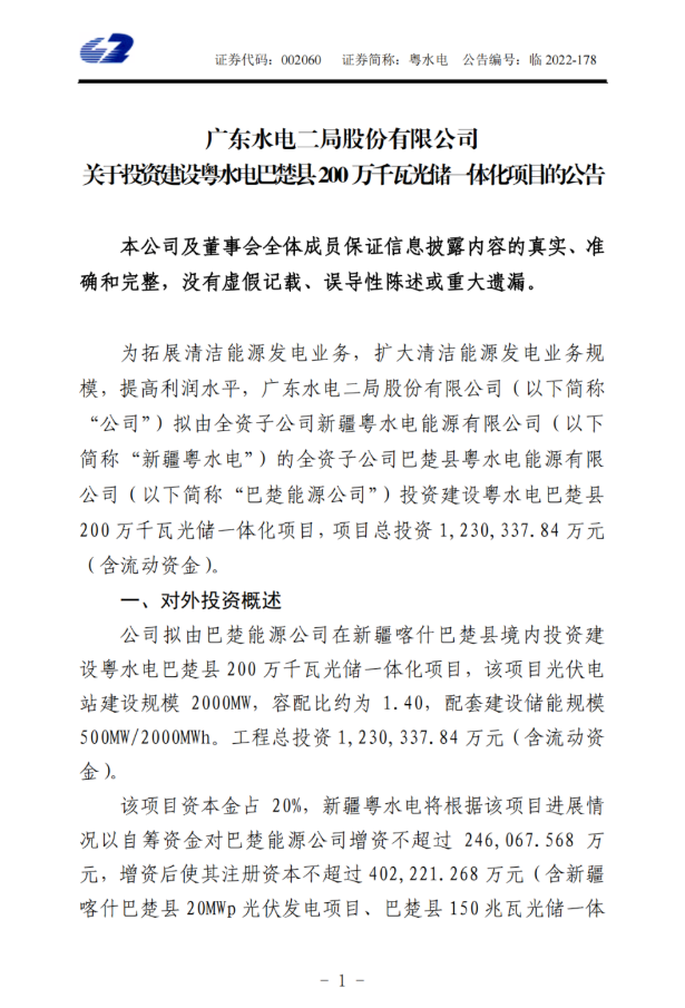 12月7日,粵水電發(fā)布公告稱,公司擬由巴楚能源公司在新疆喀什巴楚縣境內(nèi)投資建設(shè)粵水電巴楚縣200萬千瓦光儲(chǔ)一體化項(xiàng)目,該項(xiàng)目光伏電站建設(shè)規(guī)模2000MW,容配比約為1.40,配套建設(shè)儲(chǔ)能規(guī)模500MW/2000MWh。工程總投資1,230,337.84萬元(含流動(dòng)資金),項(xiàng)目工程計(jì)劃建設(shè)期20個(gè)月。