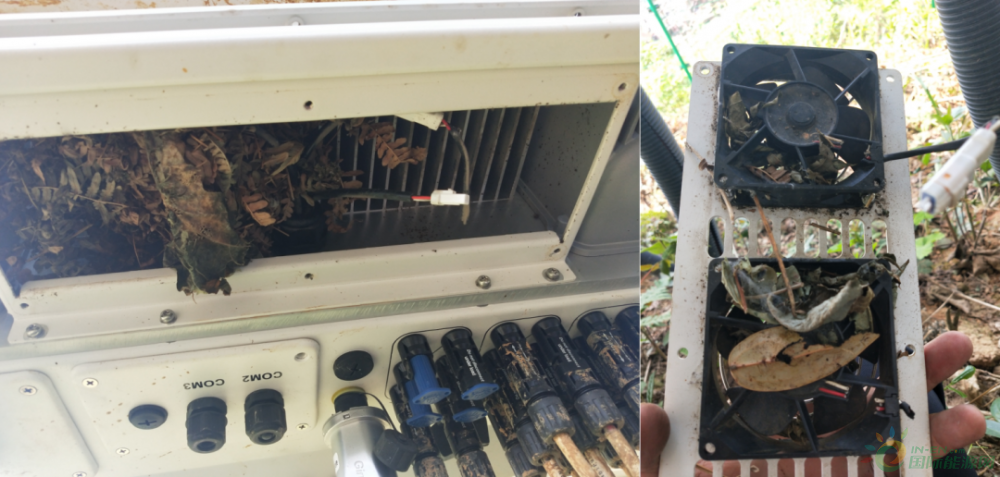 光伏逆變器安裝于戶外環境,因此戶外許多不可控因素會影響到逆變器風扇運行,比如枯枝落葉堆積、土坯泥沙卡頓、蛇蟲鼠蟻破壞等。