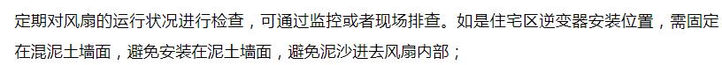 要保障逆變器散熱風扇正常運行,前期合理的安裝和后期排查運維必不可少,首先需要避免有異物積累的安裝環境或者添加保護機制,并定期通過監控和現場排查及時清理和更換風扇,以保障逆變器正常運行。