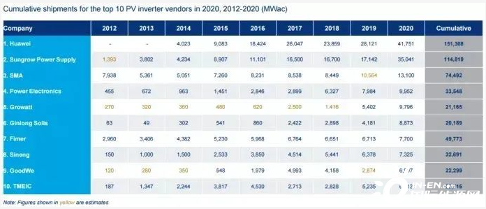(2012-2020年全球前十逆變器供應商的出貨數據統計。來源:伍德麥肯茲)