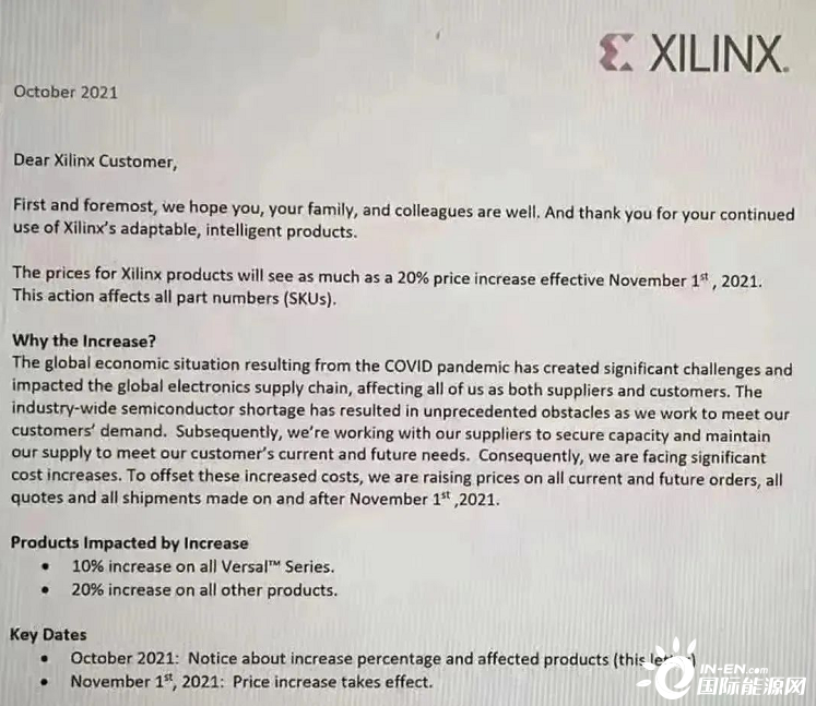 意法半導體表示,將在今年最后一個季度提高所有產品價格,包括現有庫存;安森美則是從10月初開始,對部分產品漲價生效,新價格將適用于新訂單和現有積壓訂單;此外,賽靈思也發布通知稱,將會提高2021年11月1日及之后所有當前和未來的訂單、所有報價和所有發貨的價格。