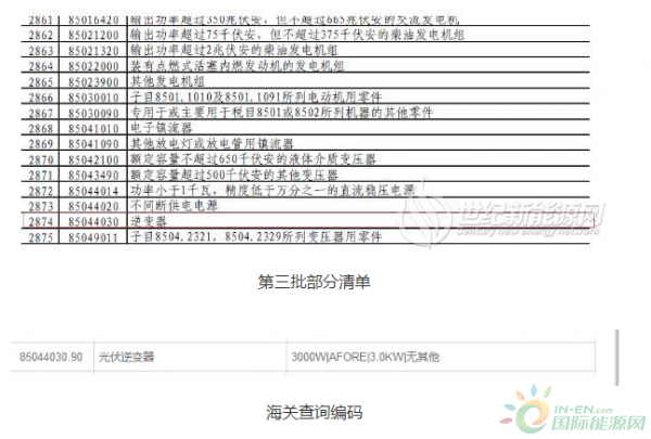 2月6日,國務院關稅稅則委員會發布關于調整對原產于美國的部分進口商品加征關稅措施的公告,其中提到自2020年2月14日13時01分起,調整《國務院關稅稅則委員會關于對原產于美國的部分進口商品(第三批)加征關稅的公告》(稅委會公告〔2019〕4號)規定的加征稅率。該公告附件1第一、二部分所列270個、646個稅目商品的加征稅率,由10%調整為5%;第三、四部分所列64個、737個稅目商品的加征稅率,由5%調整為2.5%。其中,逆變器在附件2的第三部分,由5%調整為2.5%,經查詢海關編碼,85044030稅號包含光伏逆變器。所以光伏逆變器進口關稅由原來的5%調整為2.5%。