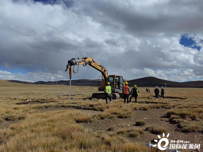 在西藏華電那曲色尼區12萬千瓦光伏發電電力保供項目工地,工人們正安裝螺旋樁。(受訪單位供圖)